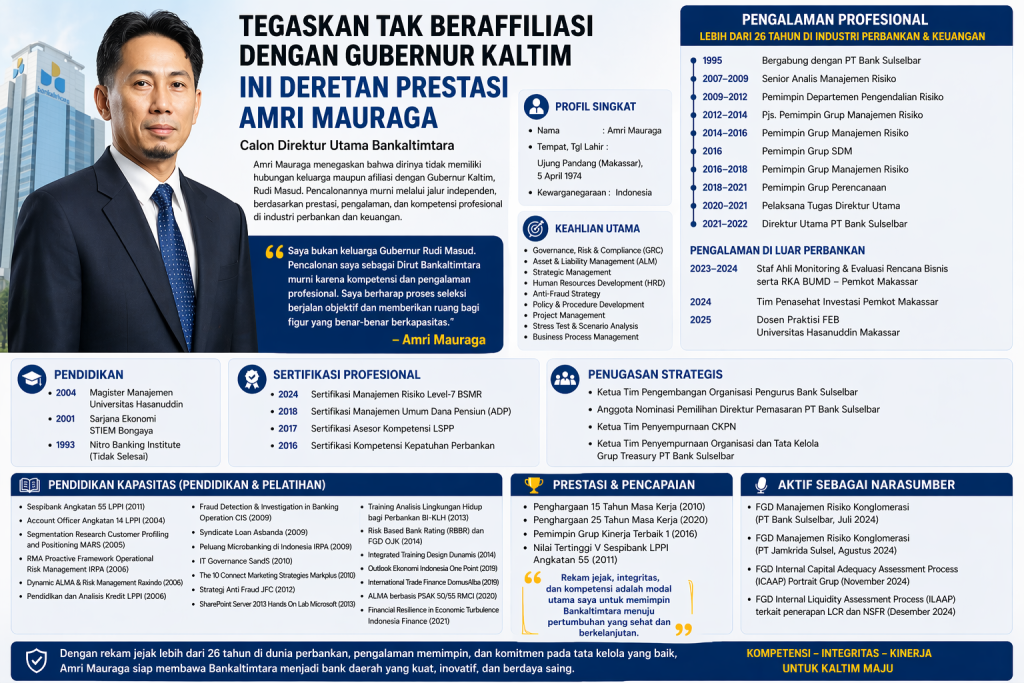 Amri menekankan bahwa pencalonannya sebagai Direktur Utama Bankaltimtara murni melalui jalur profesional dan tidak berkaitan dengan kepentingan politik ataupun praktik nepotisme. “Saya pastikan tidak ada hubungan keluarga dengan Gubernur. Keikutsertaan saya dalam proses ini sepenuhnya didasarkan pada kompetensi dan pengalaman,” ujarnya.